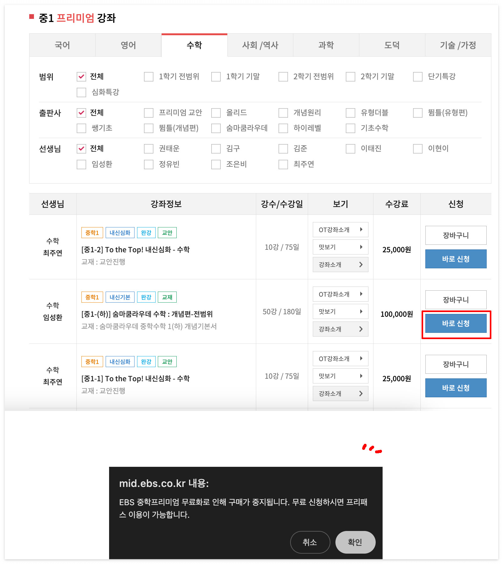 < EBS 중학프리미엄 무한수강 프리패스 신청 방법 >